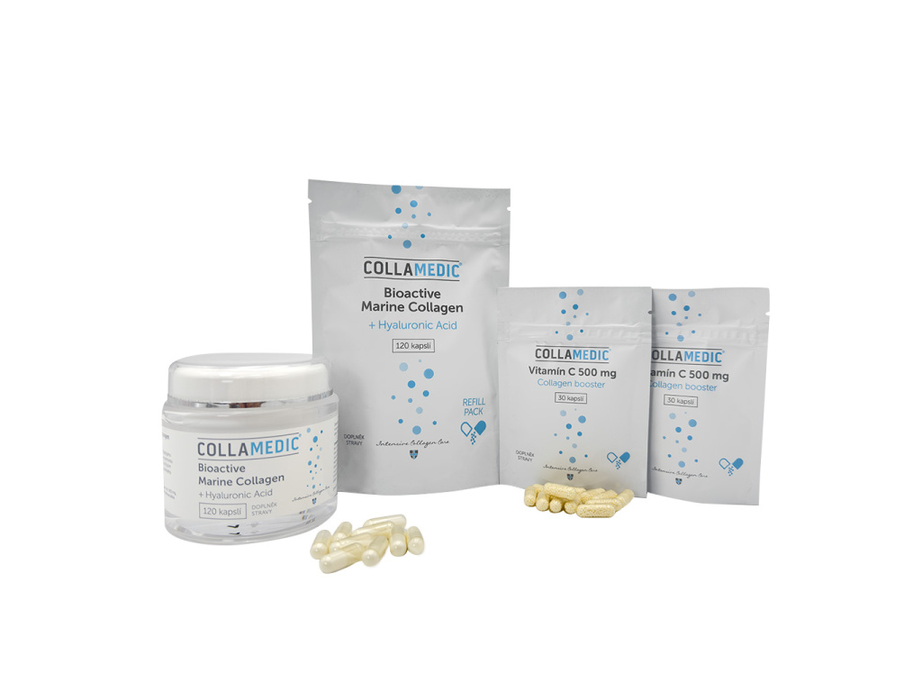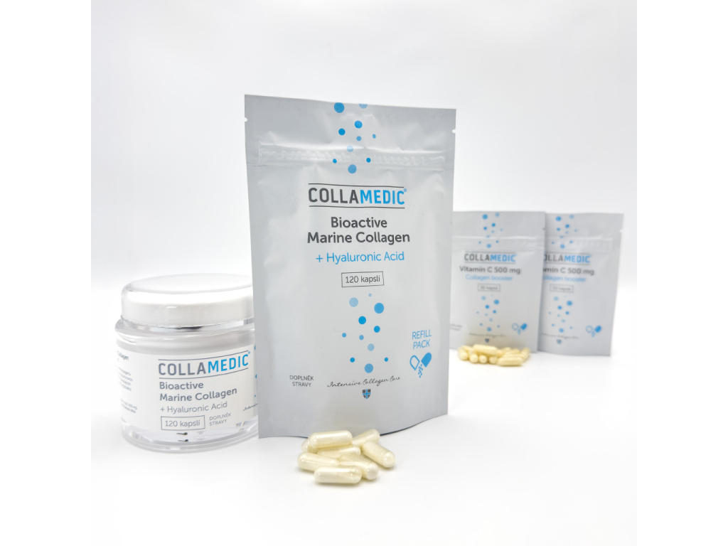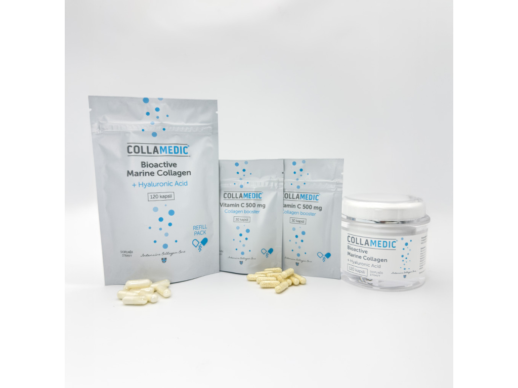 COLLAMEDIC® kapsle obsahují velké množství kyseliny hyaluronové a podpůrné množství mořského kolagenu. Obě látky jsou tělu vlastní, ale s věkem jich naše tělo produkuje méně a méně. Stárnutí pleti je ale možné zpomalit, pokud hladinu těchto látek v těle znovu zvýšíme formou doplňků stravy.