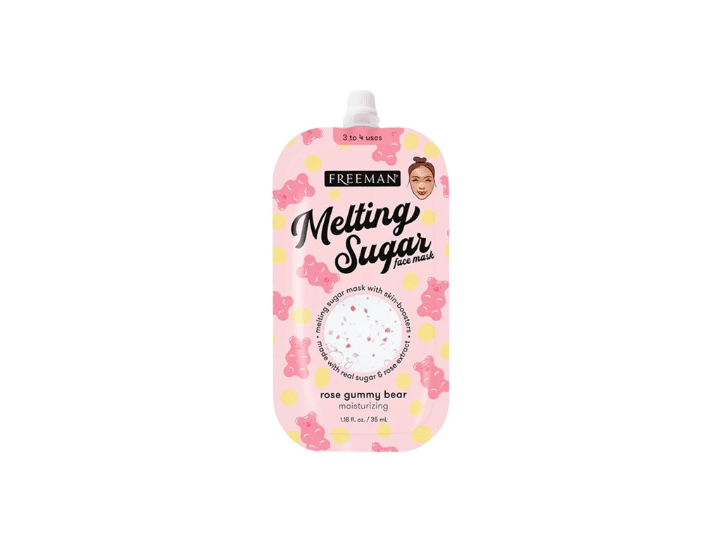 Freeman Melting Sugar Gummy Bear hydratační maska (35 ml). Krémová „melting“ textura se při kontaktu s pokožkou mění, obsahuje skutečný cukr a růžový extrakt, a dodává pleti hydrataci, hebkost a svěží pocit.