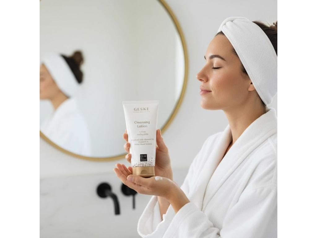 GESKE Cleansing Lotion: Odličovací mléko s mandlovým olejem a extraktem z melounu jemně čistí a zároveň hydratuje pokožku. Obohacené o vitamín E a vilín, pomáhá chránit a zklidnit pokožku. Ideální pro každodenní použití, ponechává pleť svěží a zářivou.