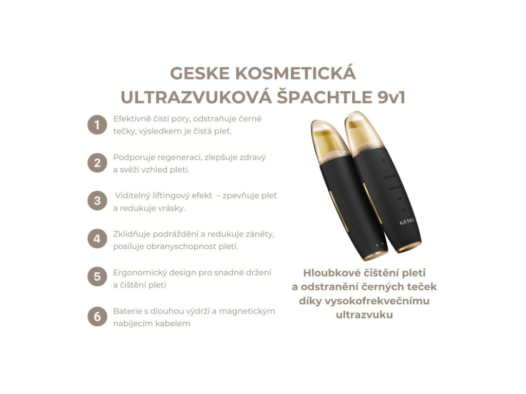 Geske kosmetická ultrazvuková špachtle na obličej čistí póry, odstraňuje černé tečky, podporuje regeneraci a zlepšuje absorpci krémů a sér. Zpevňuje pleť, redukuje vrásky a zklidňuje podráždění. Ideální pro komplexní péči o pleť.