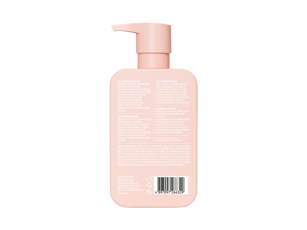 Šampon MONDAY Moisture oživuje suché vlasy směsí kokosového oleje, bambuckého másla, rýžového proteinu a vitaminu E. Toto složení zajišťuje snadné rozčesávání a hloubkovou hydrataci. Zanechává vlasy hebké, lesklé a pružné. Je uložen v elegantním balení s pumpičkou, neobsahuje sulfáty a má certifikát PETA.