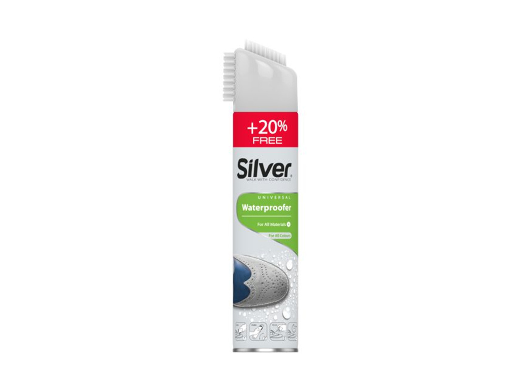 Silver Universal Spray je univerzální impregnační prostředek ve spreji (300 ml) ideální pro ochranu obuvi, oděvů, kabelek a doplňků z kůže, semiše, nubuku i textilu. Produkt vytváří neviditelnou bariéru, která odpuzuje vodu, olejové nečistoty a snižuje riziko skvrn – bez ovlivnění původního vzhledu a barvy.